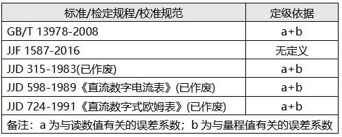 由表1可以看出,在JJF 1587-2016实施之前,数字多用表均按照(a+b)的值进行定级。